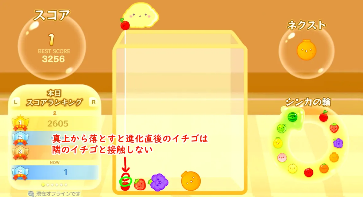 サクランボを真上から落とすと、サクランボから進化したイチゴと、もとからあったイチゴ2つが並びますが、接触はせず進化しません。
