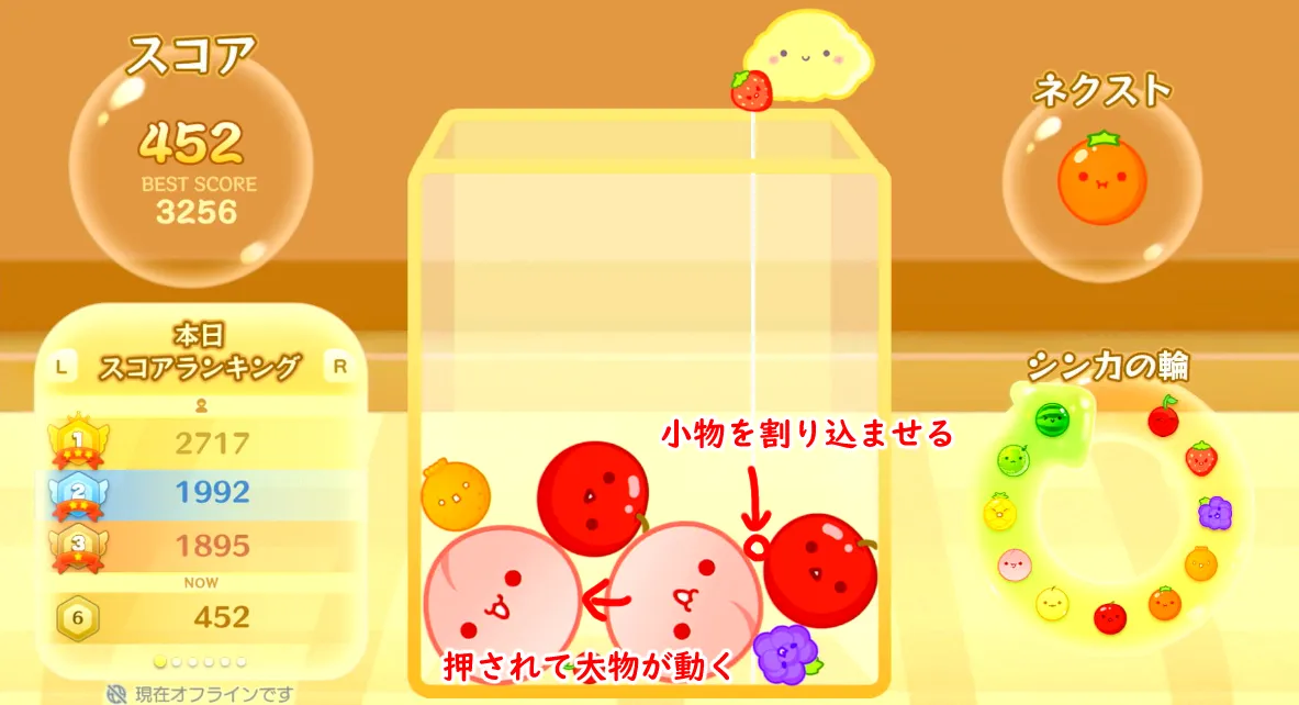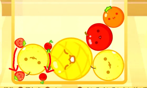 『果物と果物の間』『壁と果物の間』に、小さな果物を落とすことで、大きな果物をほんの少し動かすことが出来ます。
