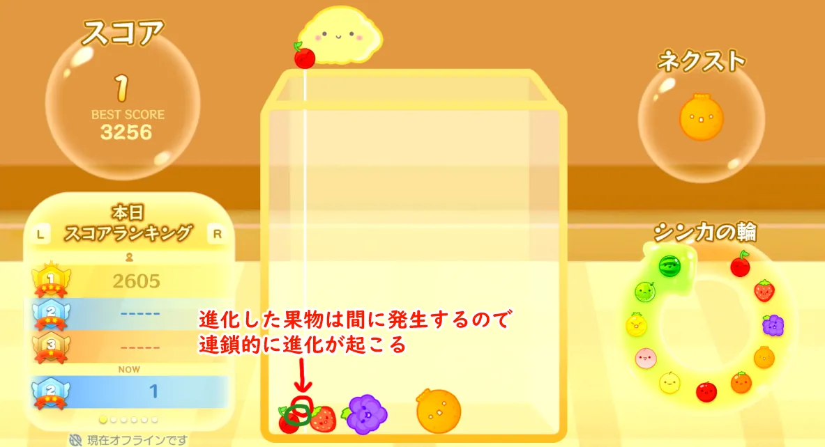 小さな果物が結合したとき、連続してさらに大きな果物を作る流れを意識します。