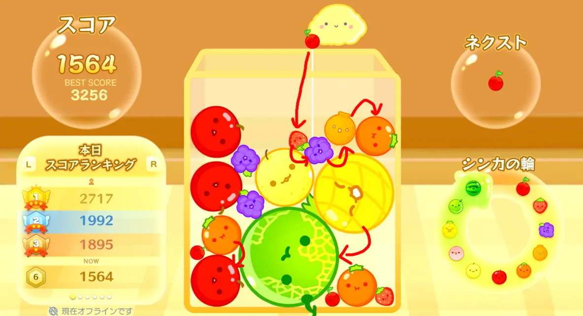 この記事を読んだなら、ただ闇雲に果物を落とすのではなく、細かなポイントを意識できるようになっているはずなので、それぞれのポイントを心がけながら、何度もプレイしてハイスコアを目指してみてください。