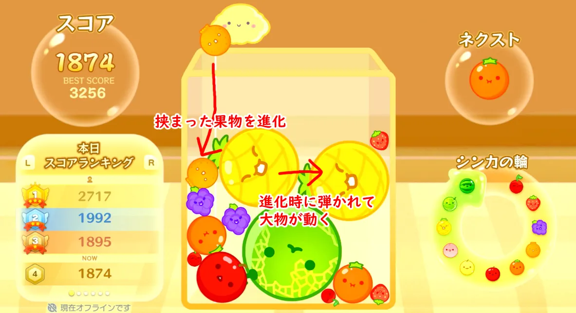壁と大物に挟まった果物を進化させることで、進化時の膨張を利用して大物を弾きます。