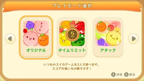 「オリジナルモード」は、いつものスイカゲームでスコアの高さを競います。 #### 勝ち負けの判定