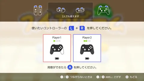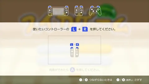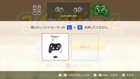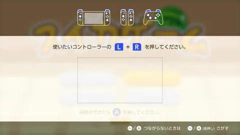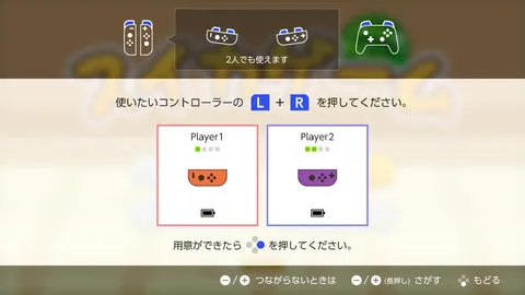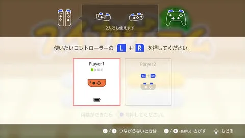 スイカゲームのホーム画面で2人プレイを選択し、コントローラー接続の画面が表示されたら、プレイヤー1人目の方が使用するコントローラーのLRボタンを押します