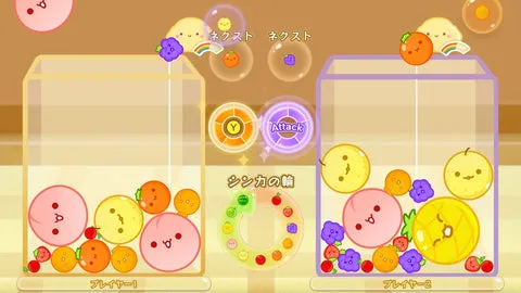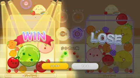 アタックモードは、5回目ごとに「シンカ」させたフルーツを、相手のボックスに送り込む事でアタックしていく対戦モードです。 #### 勝ち負けの判定