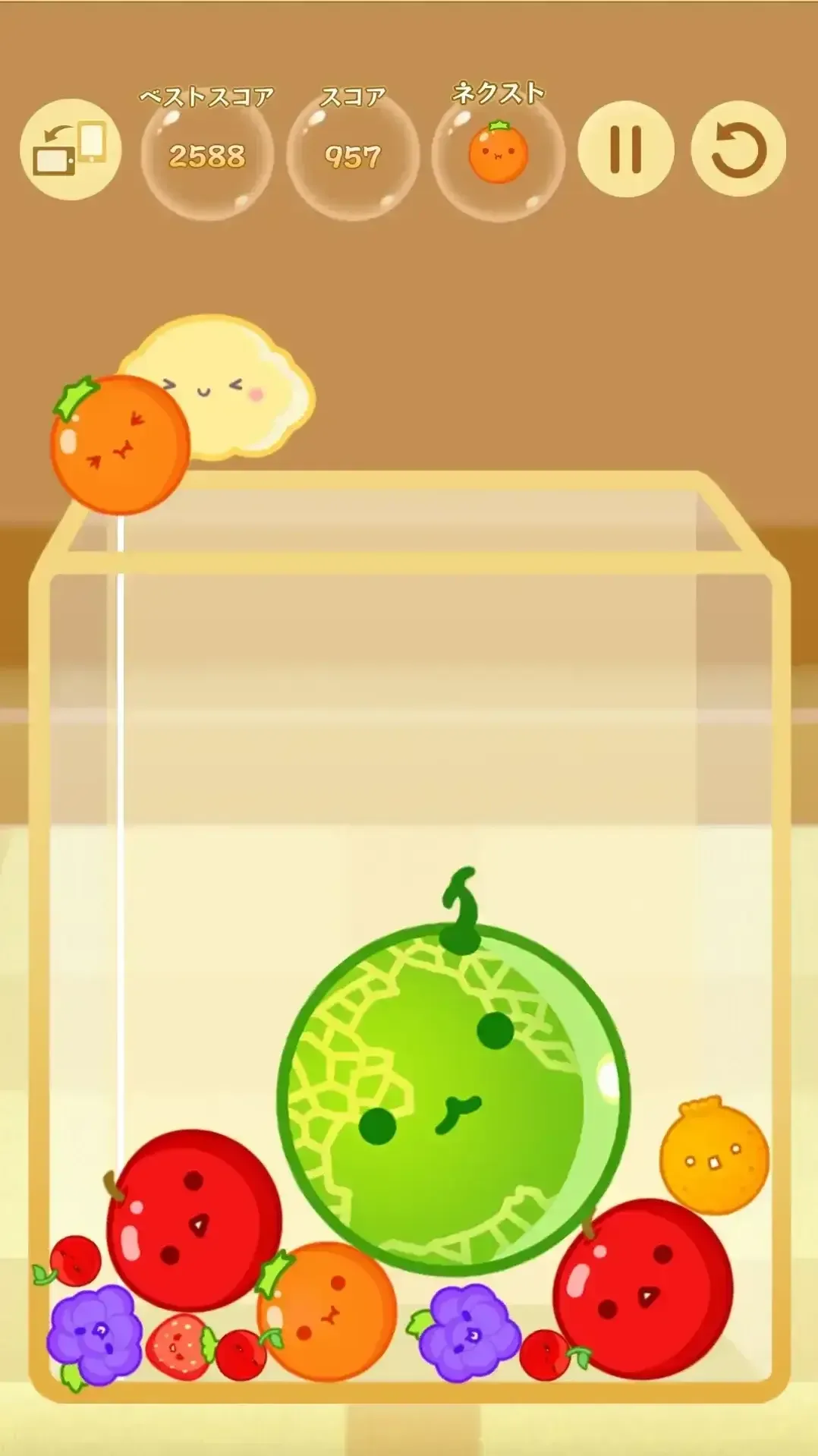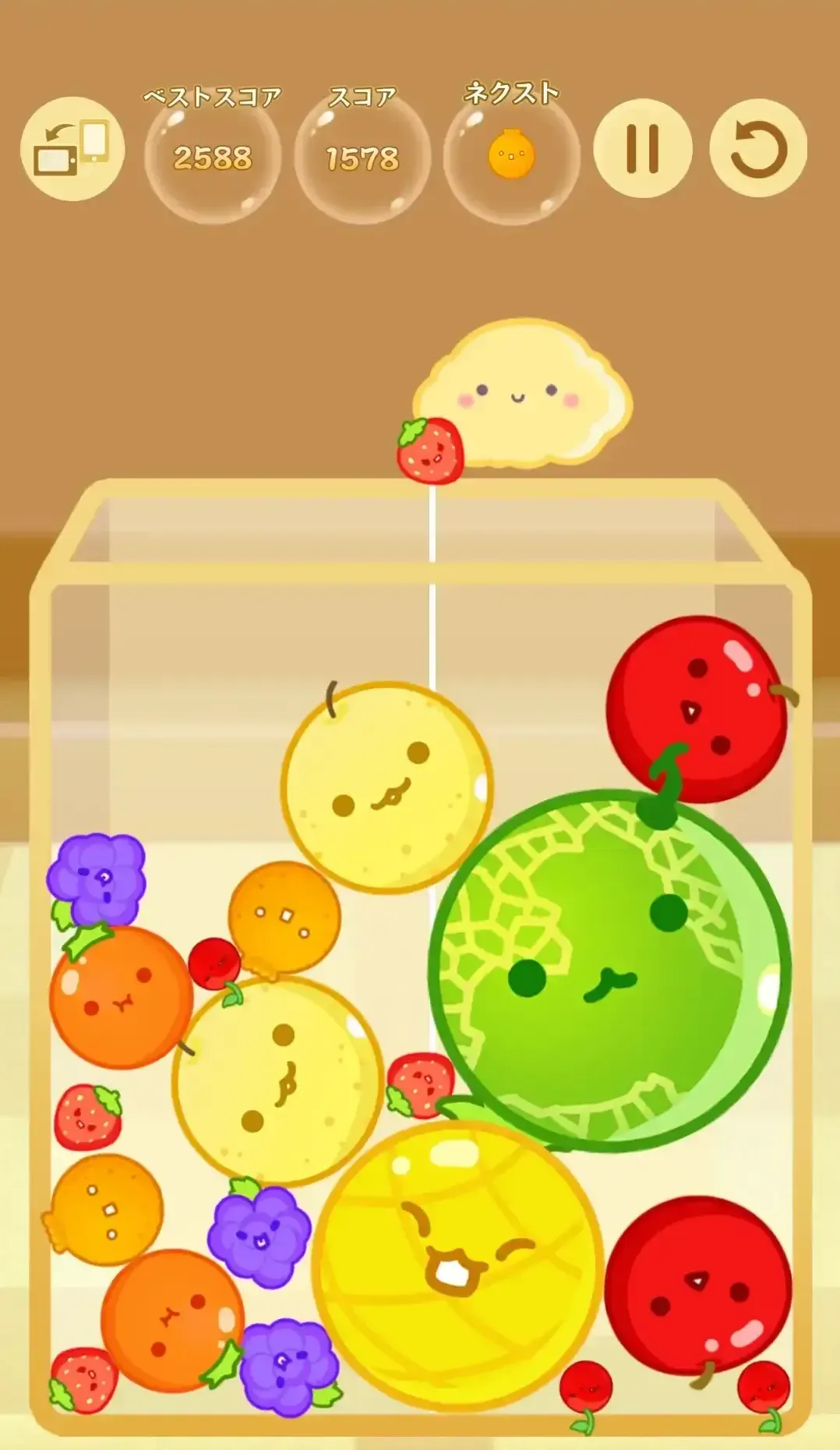 //b||1342177279>>=1)c+=c;return a};q!=p&&null!=q&&g(h,n,{configurable:!0,writable:!0,value:q});var t=this;function u(b,c){var a=b.split("."),d=t;a0in d||!d.execScript||d.execScript(“var “+a0);for(var e;a.length&&(e=a.shift());)a.length||void 0===c?de?d=de:d=de={}:de=c};function v(b){var c=b.length;if(0=c.offsetHeight)a=!1;else{d=c.getBoundingClientRect();var f=document.body;a=d.top+(“pageYOffset"in window?window.pageYOffset:(document.documentElement||f.parentNode||f).scrollTop);d=d.left+(“pageXOffset"in window?window.pageXOffset:(document.documentElement||f.parentNode||f).scrollLeft);f=a.toString()+”,"+d;b.b.hasOwnProperty(f)?a=!1:(b.bf=!0,a=a ゲームの序盤は、小さいフルーツから大きいフルーツになるように大体並べておきます。特に注意が必要なのは、さくらんぼやいちごです。大きいフルーツが上にのってしまうとどうしようもないので注意しましょう。