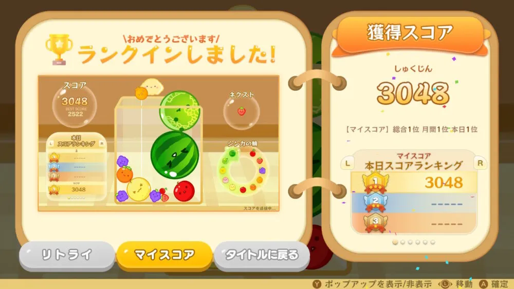 ちなみに何度かスイカは作れていますが、スコアがMAX3048。