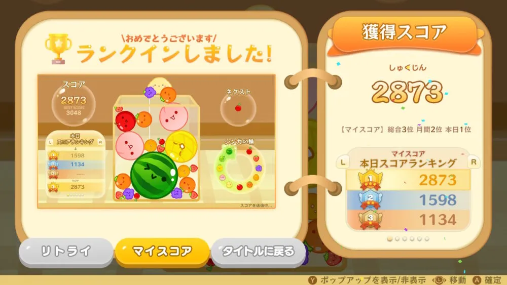 3000点を超えたときはスイカ&メロンまで行きましたが片側に寄ってしまいゲームオーバーに。