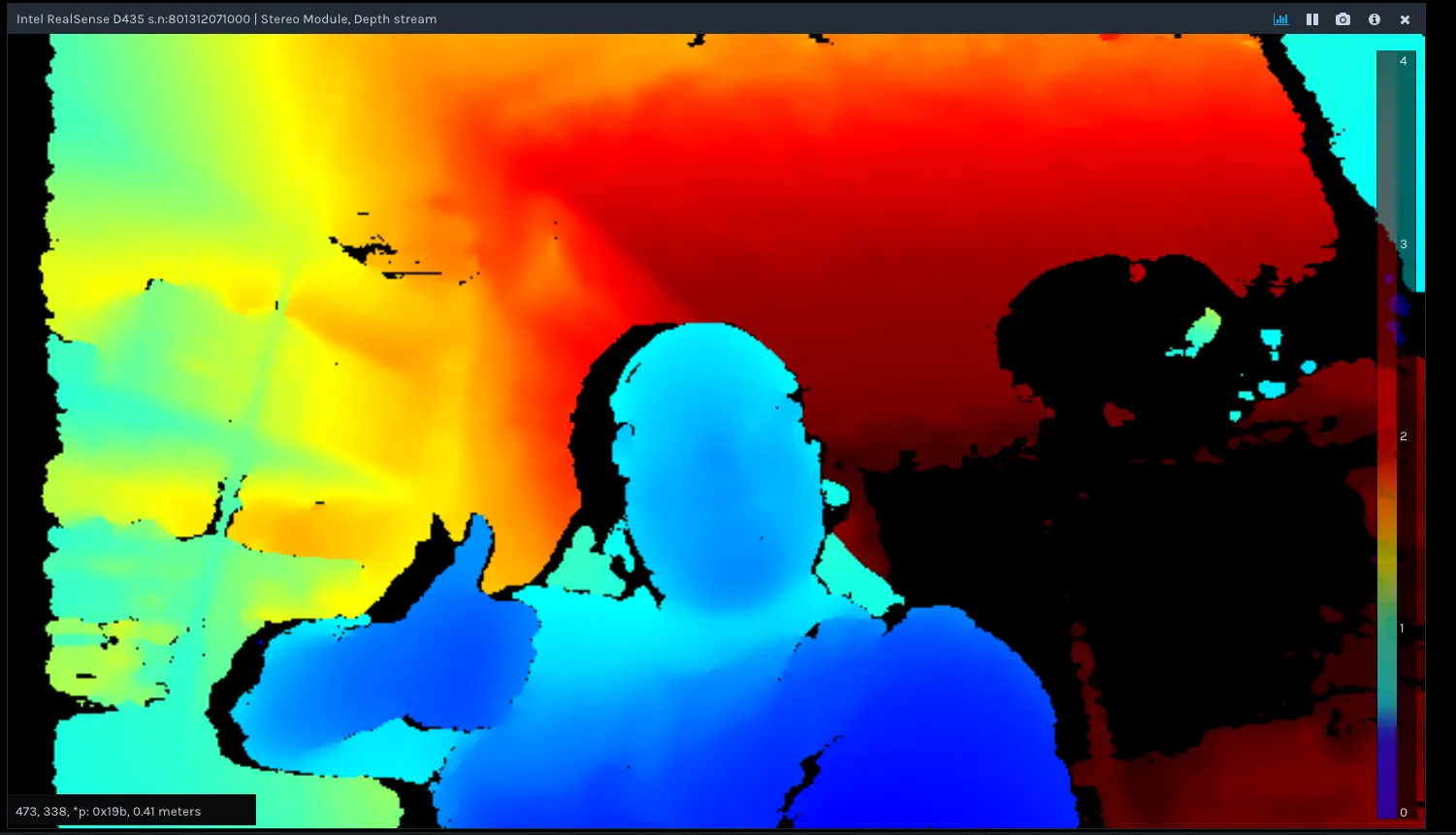 これは通常のWebカメラのように映像を撮影しつつ、カメラからの「距離」も測れるデバイス。このような感じで、カメラから近くにあるものは青く、遠くにあるものは赤く表示することができます。
