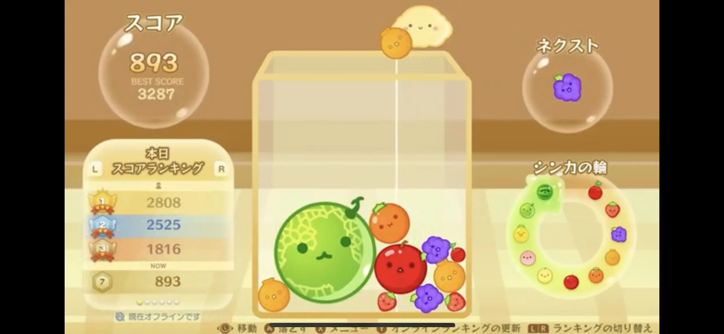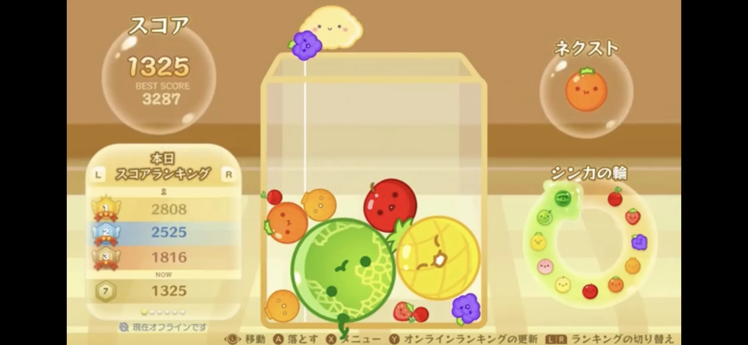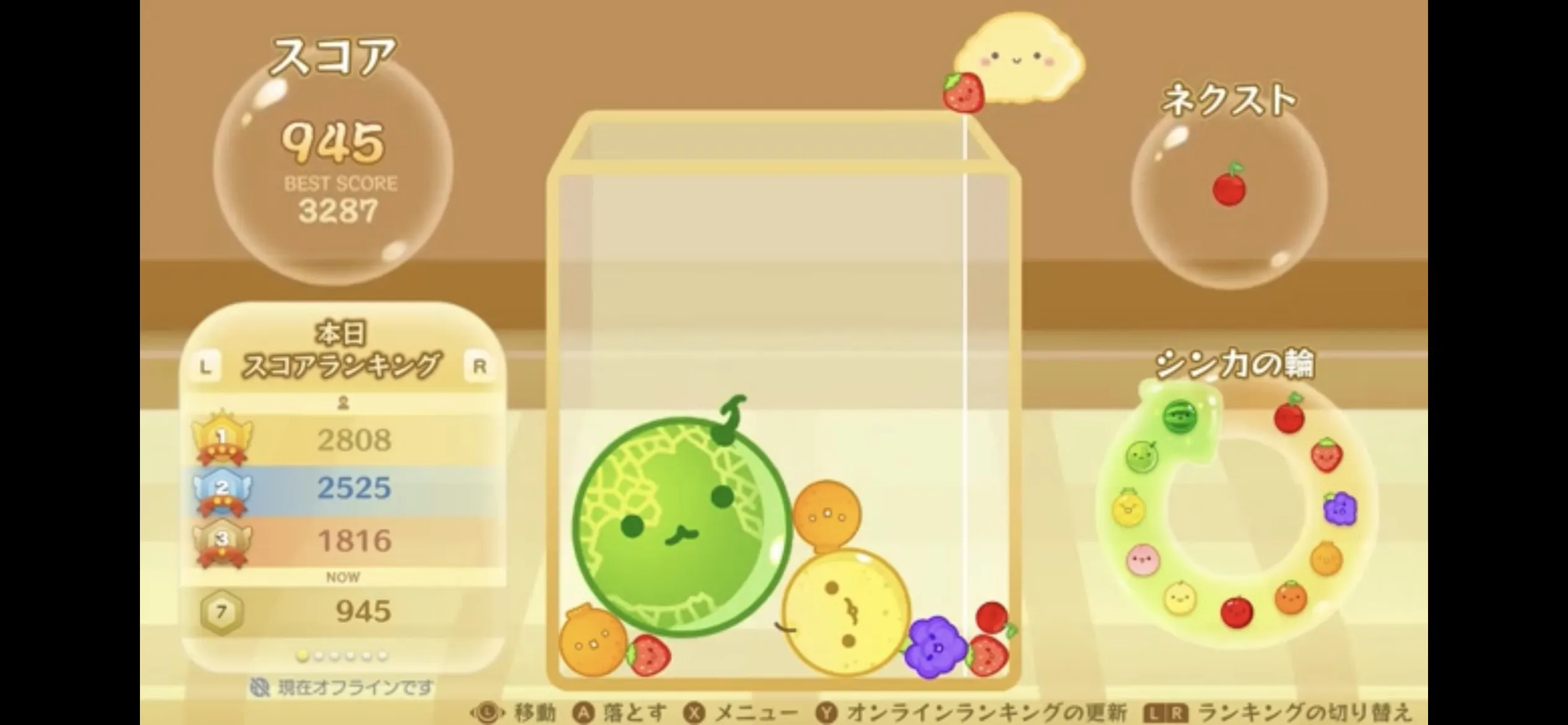 少し盤面が歪んで焦ってしまいがちですが、落ち着いて大きなフルーツに接地しているフルーツを大きくすることを心掛けましょう。