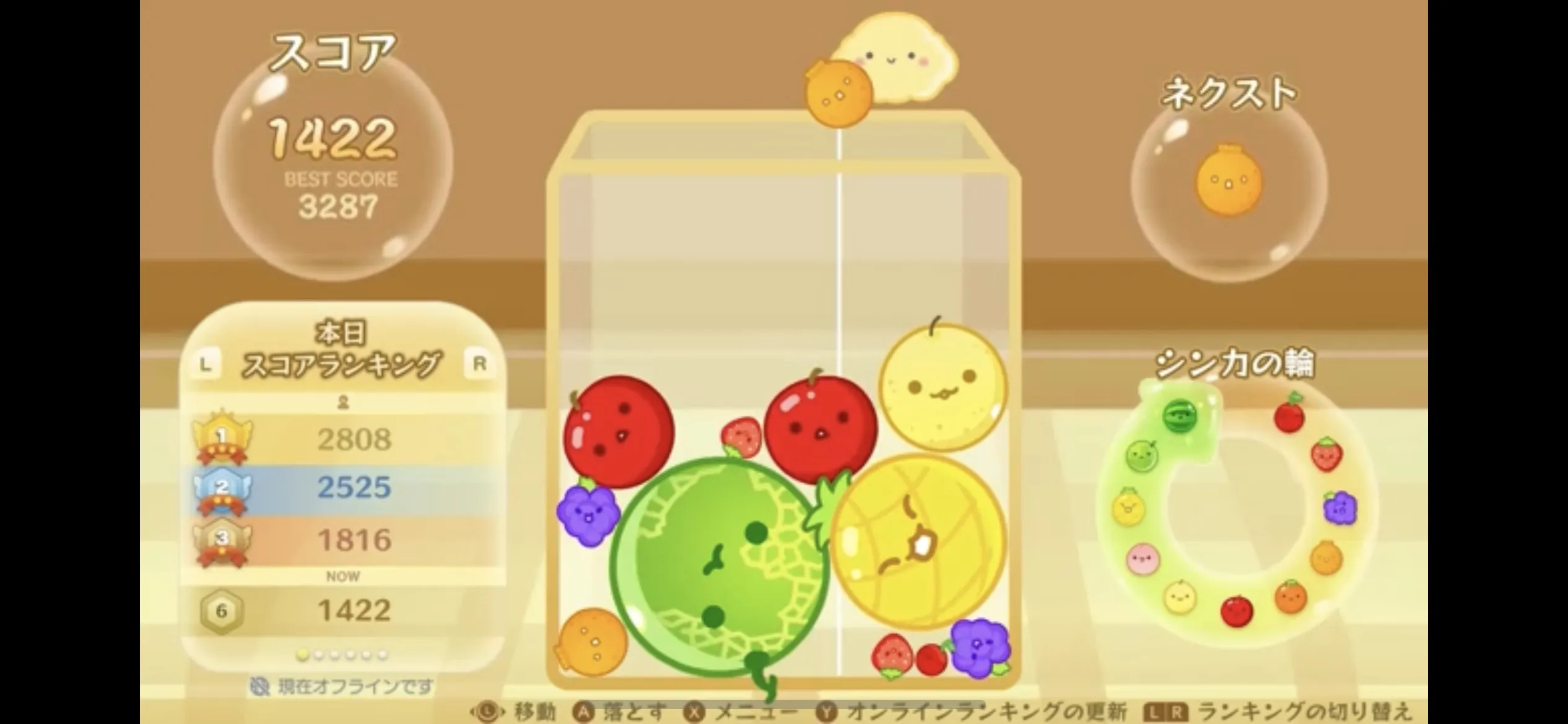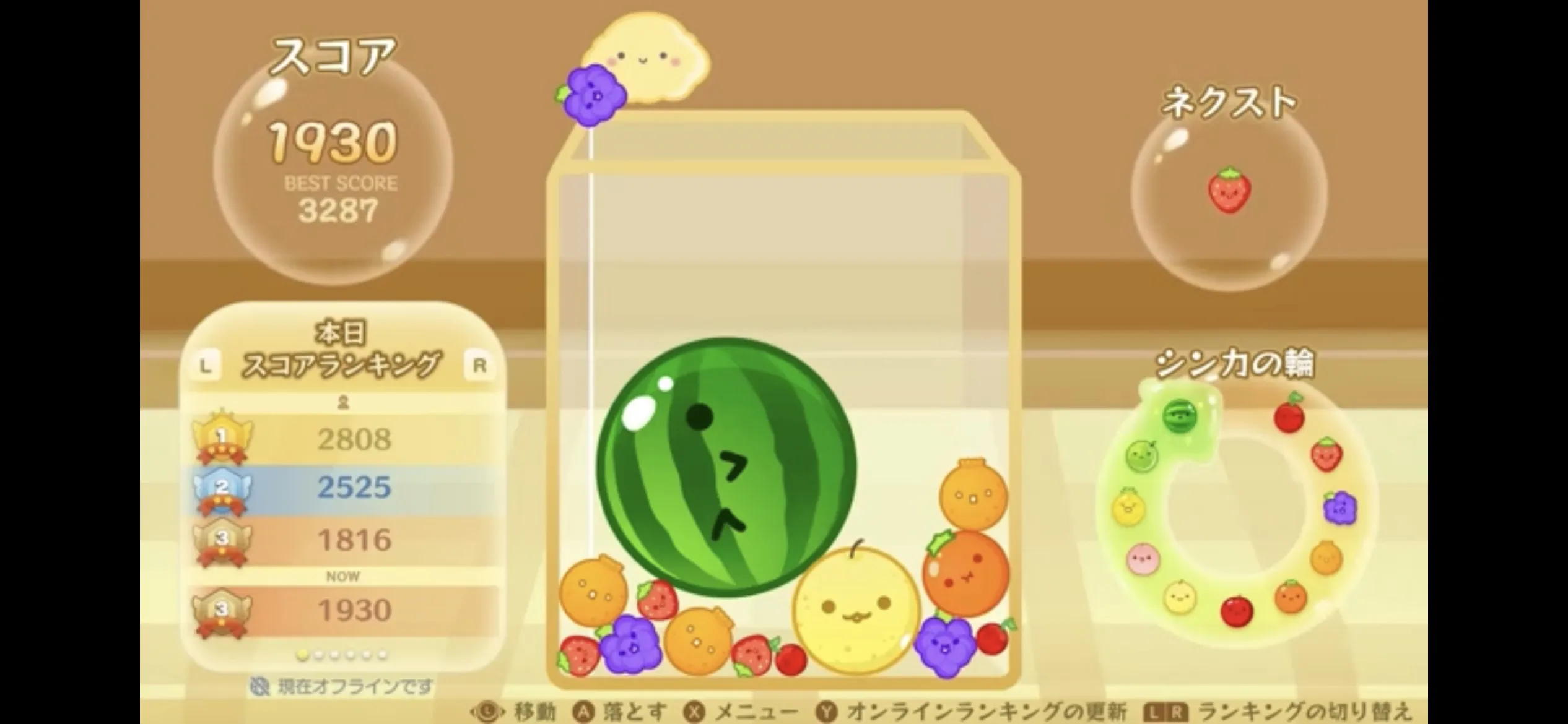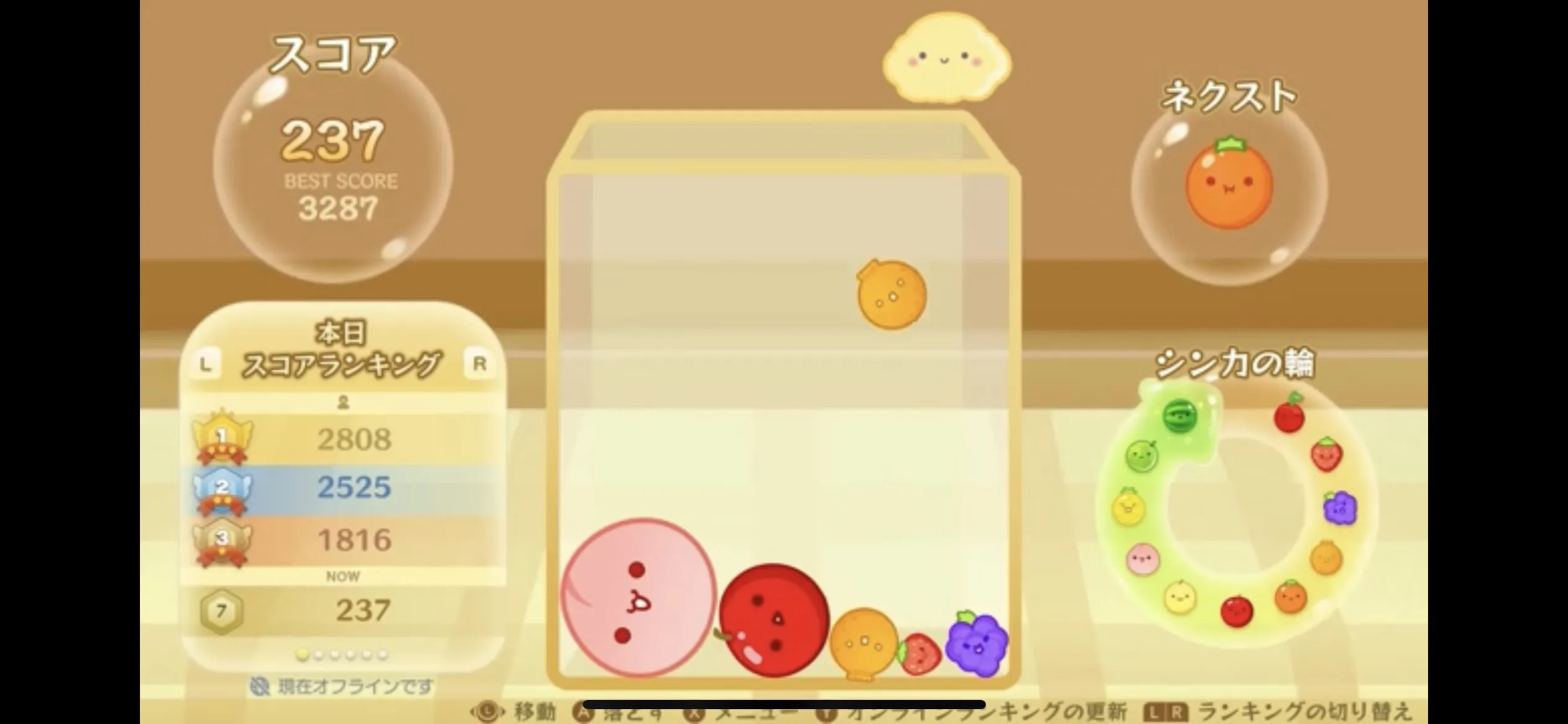 少し盤面が歪んで焦ってしまいがちですが、落ち着いて大きなフルーツに接地しているフルーツを大きくすることを心掛けましょう。